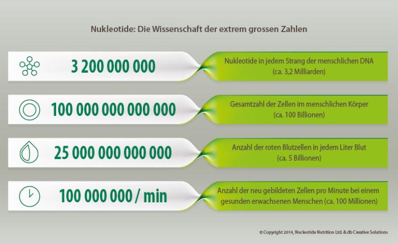Der menschliche Körper benötigt somit alleine für den Aufbau seiner DNS 100 000 000 000 000 Zellen x 3 200 000 000 Nukleotide pro Zelle. Das ist wirklich eine unvorstellbare Zahl. Zwischen 10 000 000 und 50 000 000 unserer Körperzellen werden pro Sekunde abgebaut und durch neue ersetzt oder werden repariert.